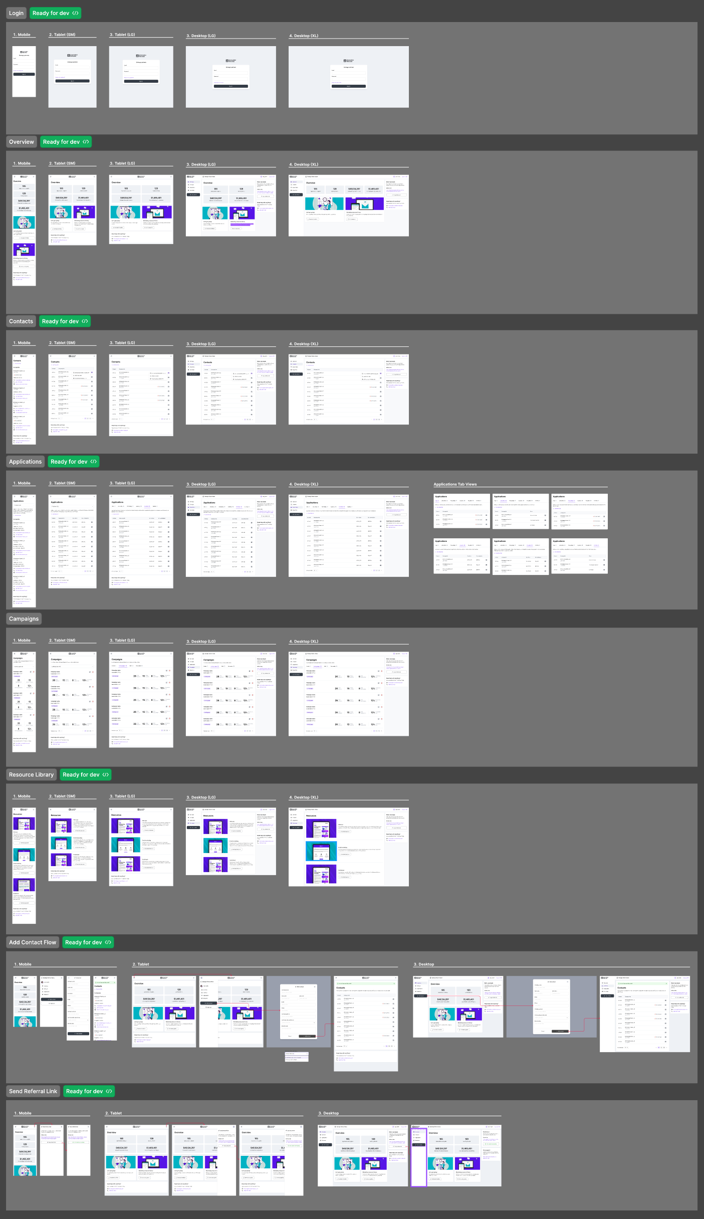 Once all designs and flows were approved by our stakeholders, I then packaged up the designs in Figma for engineering hand-off. I organized the file based on the main sections of the platform and called out the various device sizes. The file structure matched the user stories from which our engineering and product teams were working. This allowed our engineers to easily identify each section they were responsible for shipping. I set up several sessions with our dev teams to walk through the various sections of the file to mitigate any questions during development.