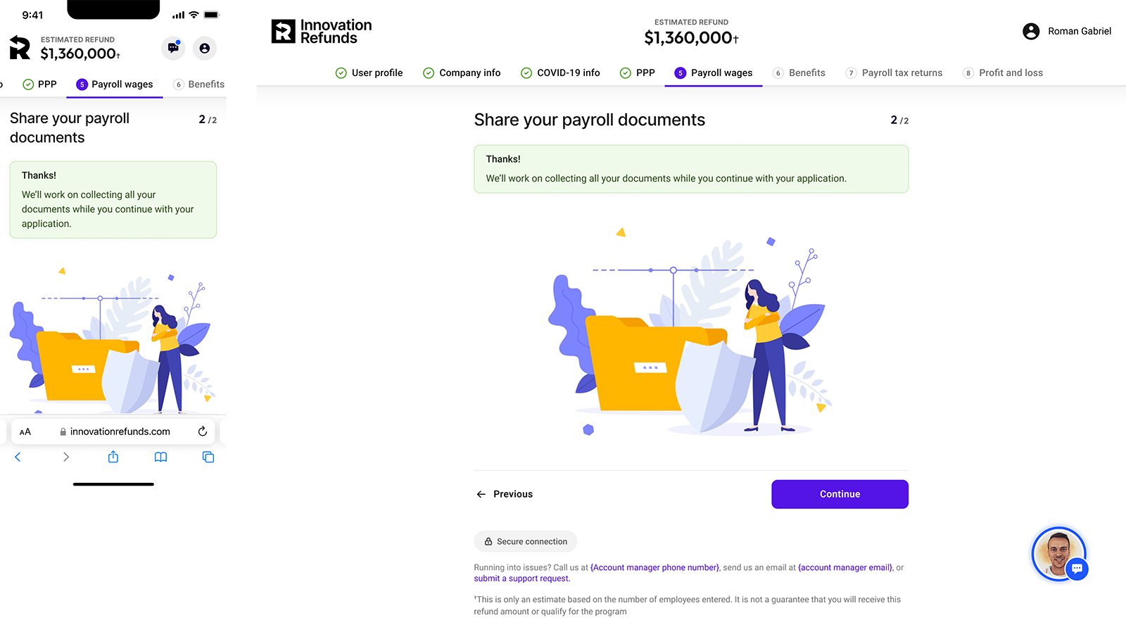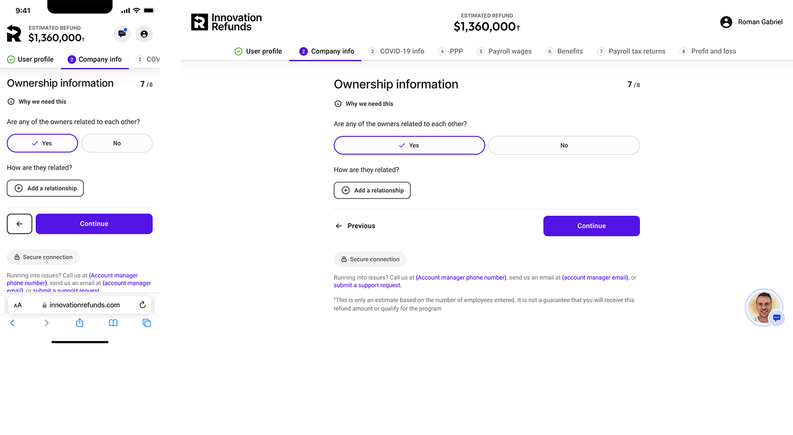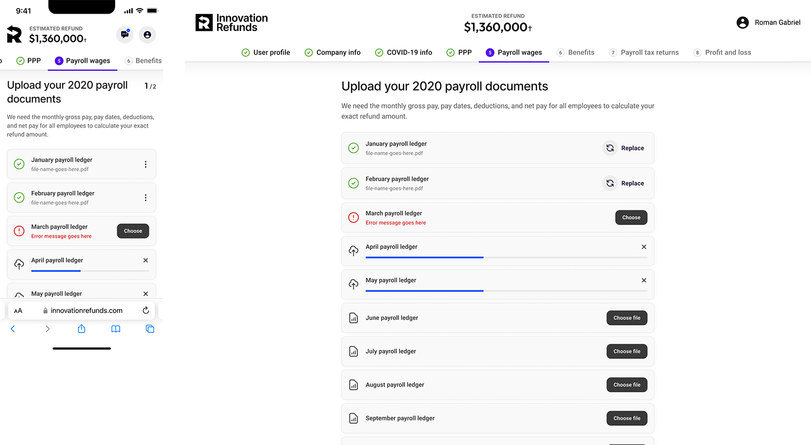 Innovation Refunds is a financial services company that provides access to specialized government funding to Small and Midsize Businesses (SMBs). The platform simplifies tax credit applications, making it easier to access financial incentives. The UI/UX Refresh project was aimed at streamlining the user experience and improve accessibility, addressing navigation issues and unclear instructions.
