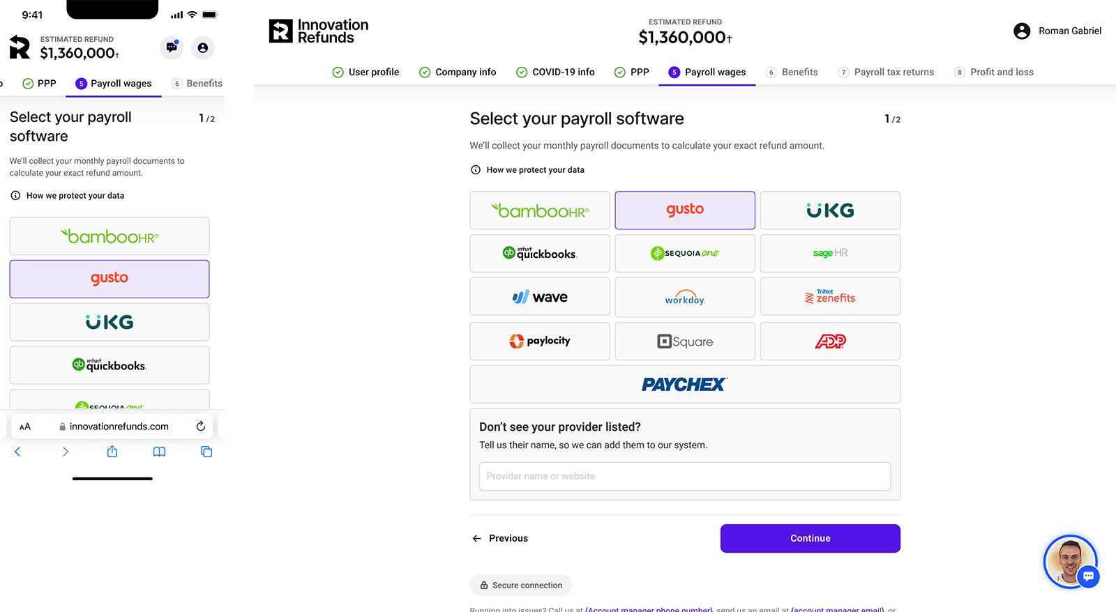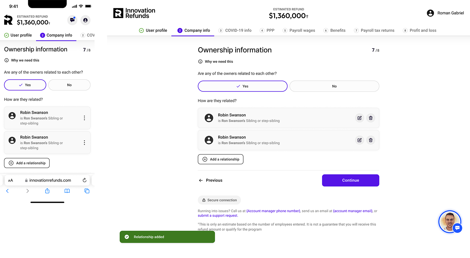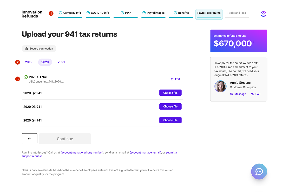 Innovation Refunds is a financial services company that provides access to specialized government funding to Small and Midsize Businesses (SMBs). The platform simplifies tax credit applications, making it easier to access financial incentives. The UI/UX Refresh project was aimed at streamlining the user experience and improve accessibility, addressing navigation issues and unclear instructions.