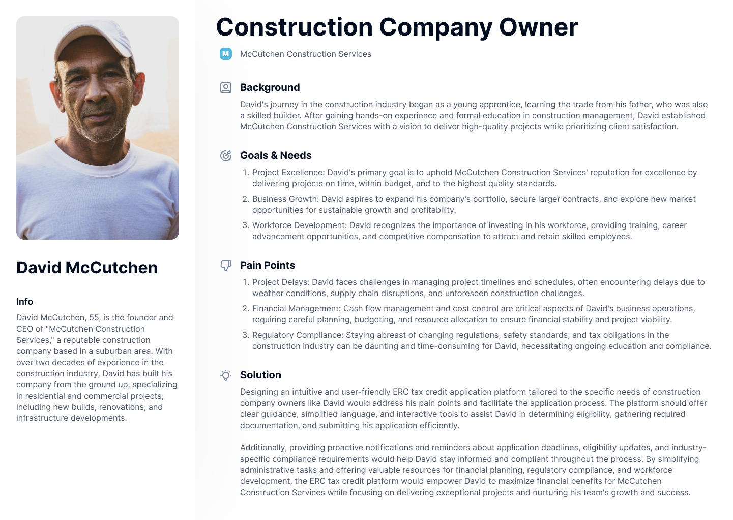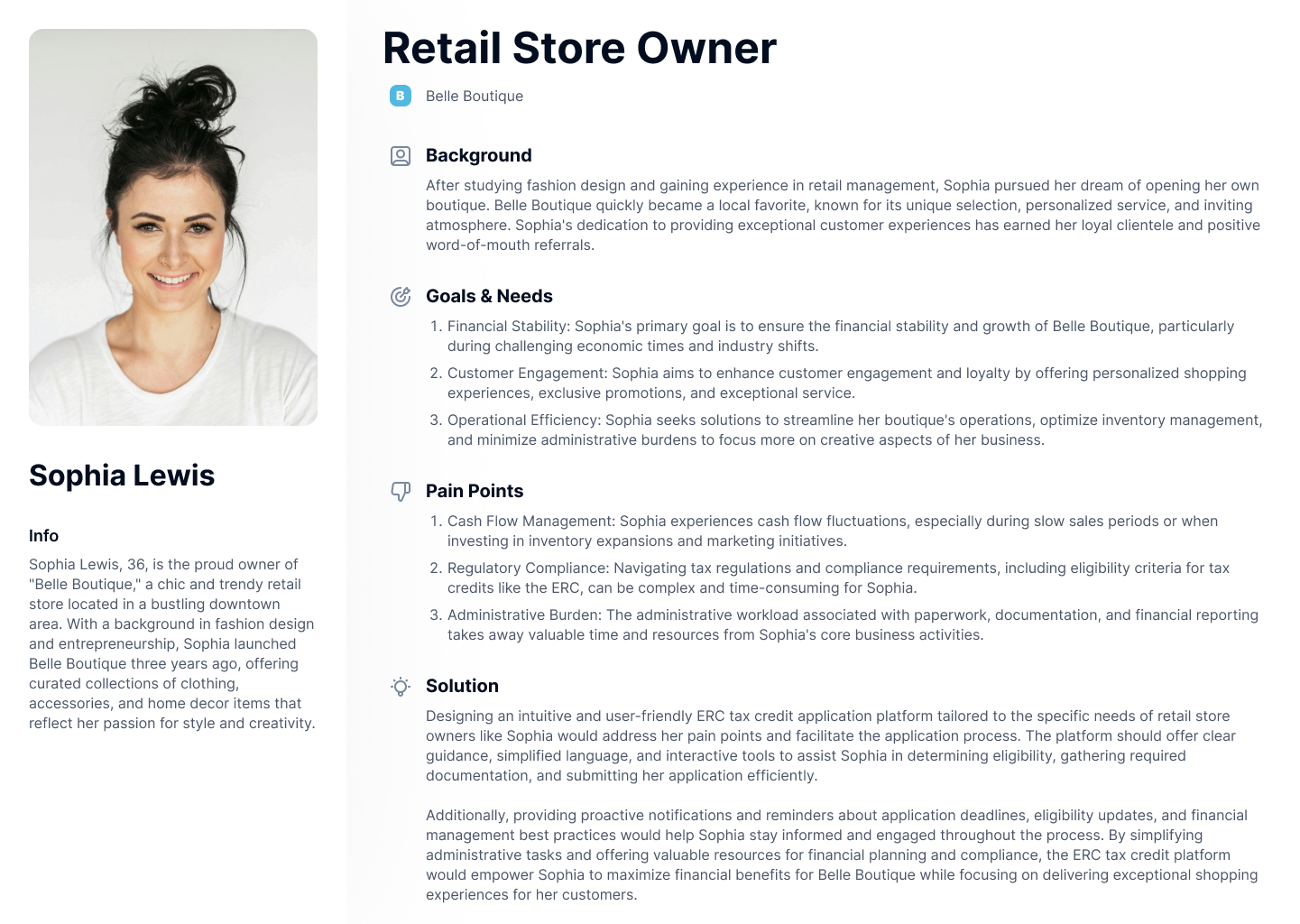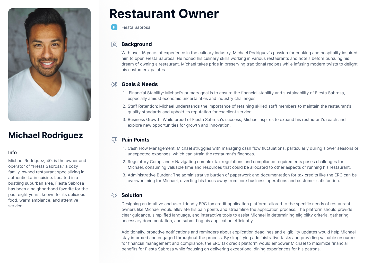 After gather our user insights, we translated this feedback into user personas for each customer segment from user interviews, surveys, and data gathering. These dynamic personas detailed demographics, goals, challenges, and behaviors, grounding our design decisions in empathy. Throughout the design process, personas informed ideation, prototyping, and usability testing, ensuring solutions resonated with user needs and creating an intuitive, accessible application experience.