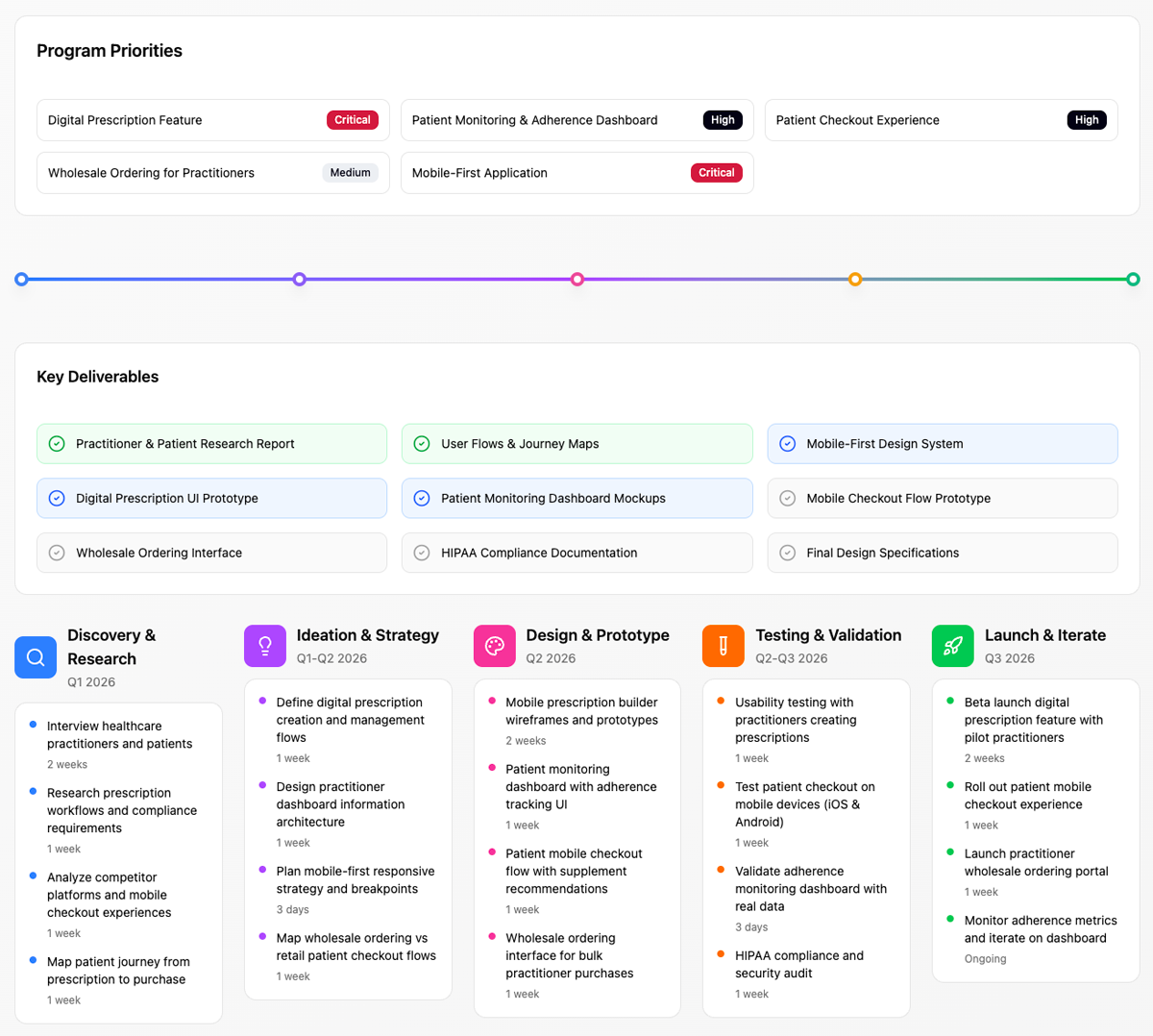 In order to set forth a phased approach for delivery to stakeholders, I developed a high-level outline of the design team's process methodology. This allowed the greater product team to level-set expectations for delivery of required design artifacts.